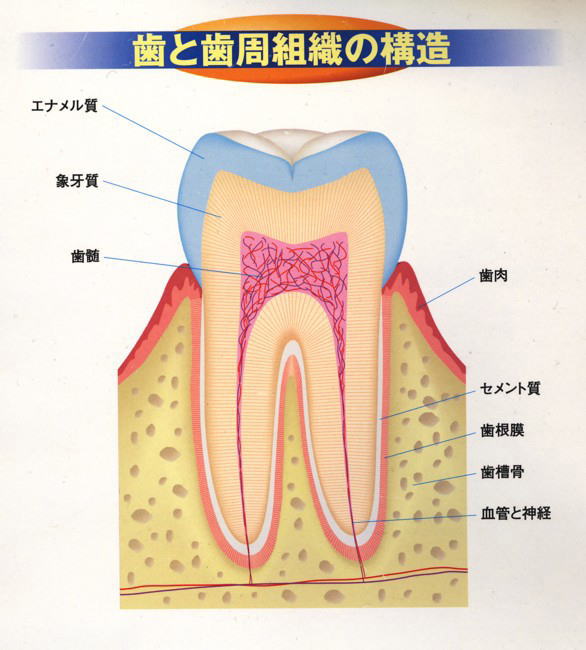 図を見るとわかるとおり歯には歯根の先端から栄養を補給する血管と一緒に痛みを感じる知覚神経が入ってきています。むし歯が進行するなどして痛みが出てくると、やむを得ず抜髄する(神経を取る)ことが必要になることがあります。