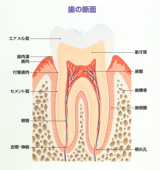 歯は化学的には燐酸カルシウムの結晶体(ハイドロキシアパタイト)からできていて、組織学的にはエナメル質、象牙質、セメント質から成っています。