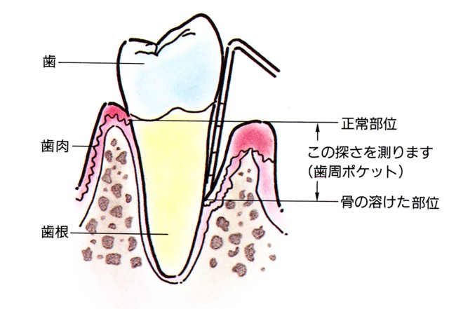 最近歯科医院を訪れると、治療にかかる前に問診表の記入、レントゲン検査、お口の中の写真の撮影、歯周病についての一般的な説明を聞いたりしたあと、ポケットの深さの検査を経験す方が多くいらっしゃると思います。この「歯周ポケットの深さを調べること」が『プロービング』です。歯と歯肉の境目の部分には、本来わずかな(0.5〜1ミリ)スキマがあります。この部分が病気のため深くなると「歯周ポケット」と呼ばれるようになります。この歯周ポケット検査(プロービング)は歯周病の進行度合いを示す尺度の一つになると同時に、今後の治療の方針を決める際の参考データになります。またこの検査の際にポケット内に出血があるかどうかを調べますが、この出血の有無も歯周病の診断の参考になります。