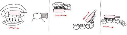 スクラッビング法は毛先を歯面に直角に当てて、少し加圧しながら近遠心方向に小刻み振動させます。一歯ずつ移動させながら行うことが大切です。