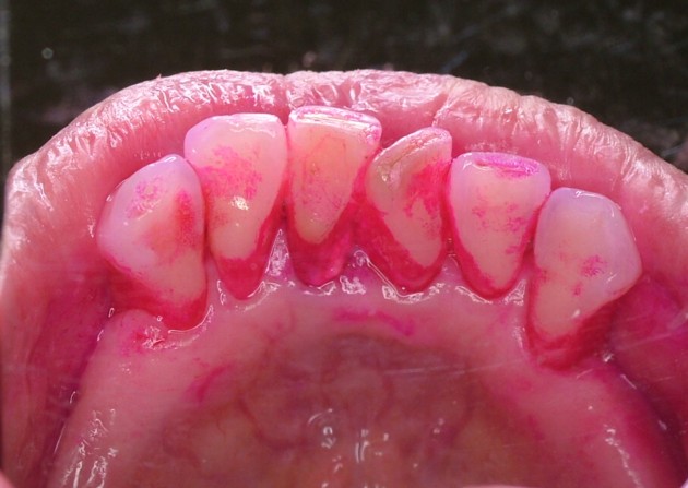 歯石はプラークが石灰化したものです。その表面は粗造でプラークがさらに付着しやすくなります。歯石の組成は 8割がカルシウムなどの無機質、残りがたんぱく質などの有機質からなっています。(右下写真は下顎前歯の内側に沈着した歯石)