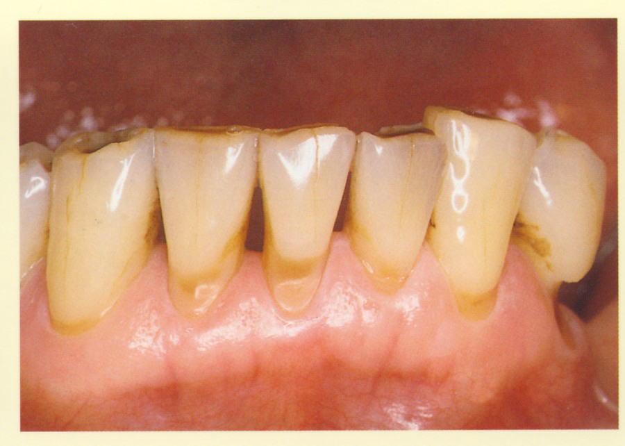 歯は人間の体の中でもっとも硬い組織です。ところがこの硬い歯がむし歯でもないのに削れてしまうことがあります。歯ブラシに歯磨き剤をたっぷりつけてごしごしと横磨きをしていると長い間には磨り減ってきます。そしていったん表面の硬い組織(エナメル質)が削れて内側の軟らかい象牙質が露出すると、そうしたブラッシングによってさらに容易に歯は削れてきます。こうして生じた歯質の欠損の形が楔(くさび)の形に似ていることから『楔状欠損」と呼びます。(写真左下)